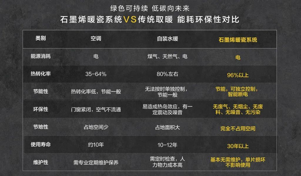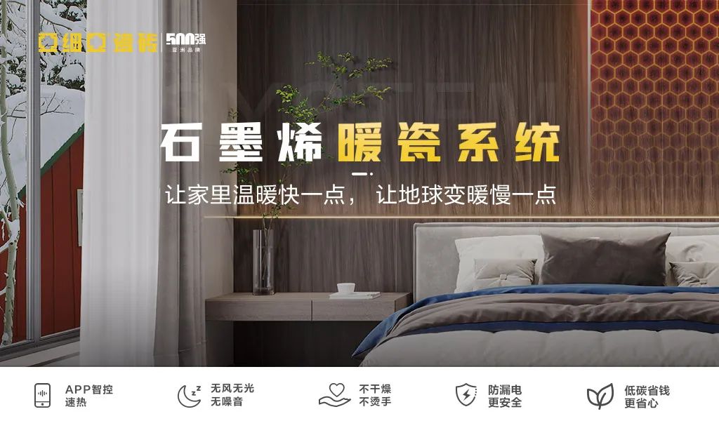 石墨烯暖瓷係統,4層智控係統搭載石墨烯內核,30分鍾速熱。使用APP可遠程操控,精準分區控製溫度,讓你從進門的那一刻便能感受到家的溫暖。