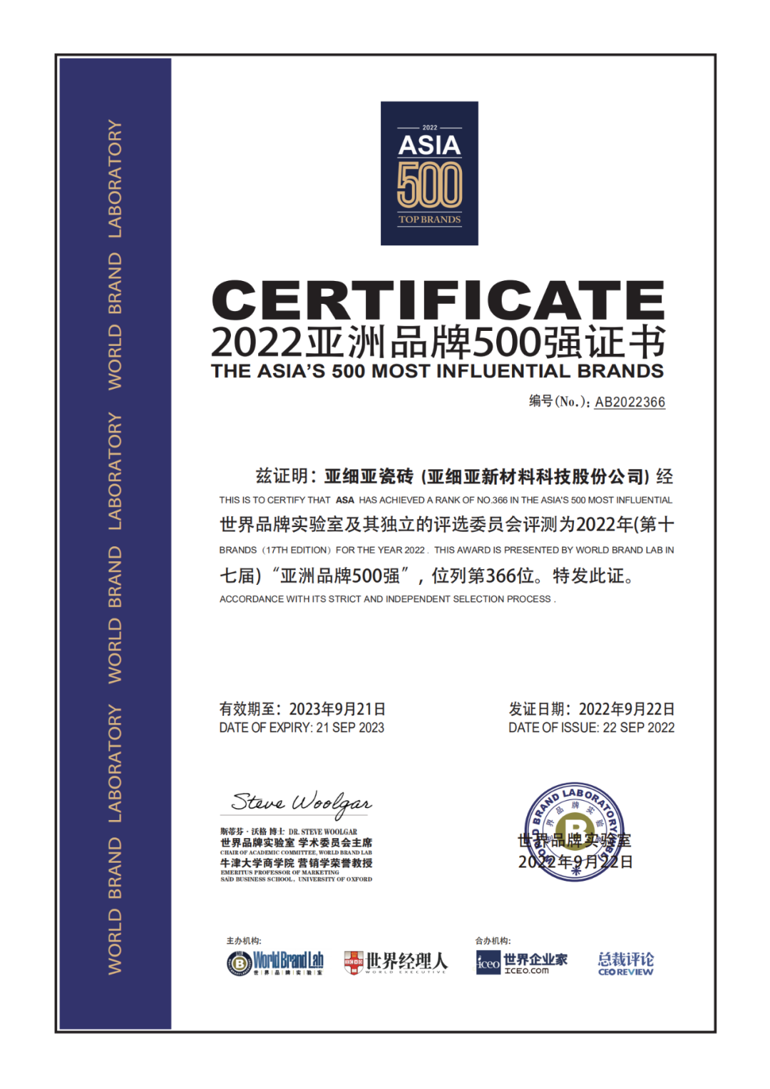 由世界品牌實驗室(World Brand Lab)主辦的“亞洲品牌大會”於9月22日在上海召開。會上發布了2022年《亞洲品牌500強》排行榜。這是世界品牌實驗室第十七次對亞洲品牌的影響力進行測評。 此次測評中,共有20個國家和地區的包括亞青青草免费在线视频瓷磚在內的500個品牌入選,一同上榜的還有豐田汽車、國家電網、工商銀行、海爾、騰訊、三星、索尼、華為等知名企業。這也是亞青青草免费在线视频瓷磚連續第七年榮登該榜單,在上榜的瓷磚品牌中排名第二。