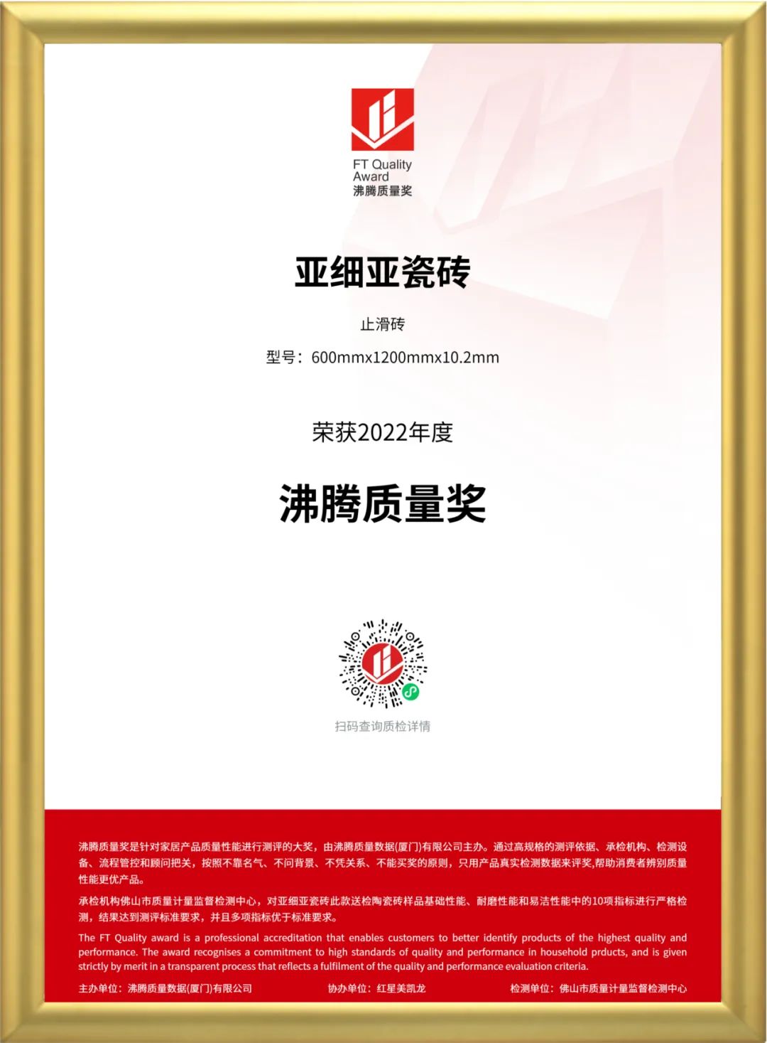 近日,備受家居行業和市場矚目的2022年度沸騰質量獎重磅揭曉。經過沸騰質量獎組委會嚴格審核評估,亞青青草免费在线视频青青草原网址憑借著超人氣、高品質、穩實力的卓越品質,榮獲“沸騰質量獎”。再次印證了亞青青草免费在线视频瓷磚對匠心品質的不懈追求。