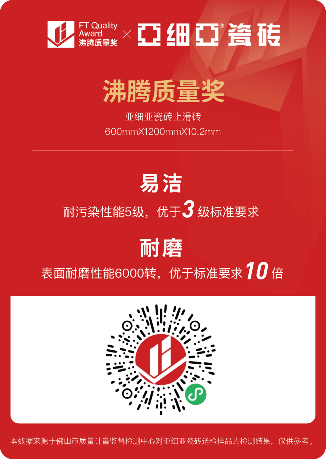 被譽為“家居質量屆奧斯卡”的“沸騰質量獎”是針對大家居建材產品質量性能進行專業測評的權威大獎。 由中國建築衛生陶瓷協會、中國建築裝飾協會、全國衛生產業企業管理協會抗菌產業分會、中國質量認證中心、國家家具質檢中心技術聯盟、中國質量俱樂部共同指導,沸騰質量獎家居產品質量性能測評組委會主辦,19家專業質檢機構聯合檢測,以高標準的測評依據、承檢機構、檢測設備、流程管控和專家顧問公平、公正評獎,幫助消費者甄選優質產品。 組委會秉持“精工品質 用數據說話”原則,對“亞青青草免费在线视频青青草原网址”測試樣品的易潔性能、耐磨性能中的多項指標進行嚴格檢測,結果全部項目符合標準要求,並且易潔、耐磨性能指標遠優於標準要求,成為行業質量標杆。