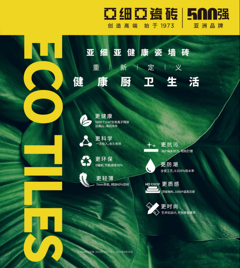 亞青青草免费在线视频在2018年發布了一個全新產品品類:ECO生態健康瓷磚,能持續穩定釋放5000個/ cm³負氧離子。一間鋪貼這款磚的房間,裏麵的負氧離子含量相當於高山森林的含量,在家也能享受森林浴。