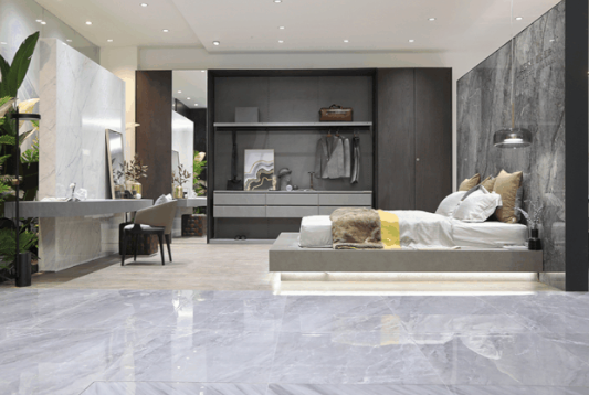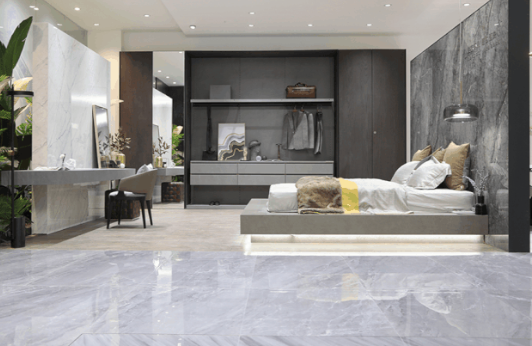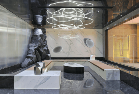 與前台紋理一致的吊燈,運用了岩板超薄超輕的裝飾性能,讓空間統一感更強。