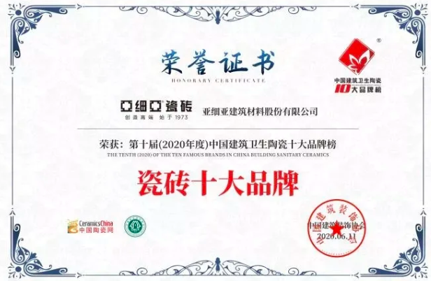 2020年8月31日,由中國建築裝飾協會主辦、中國建築裝飾協會材料應用分會、中國陶瓷網承辦的“2020年度建築衛生陶瓷十大品牌”於杭州G20峰會會場正式公布。廣東省裝飾行業協會副會長 餘靜贛、廣東省建材協會副會長 張旗康、佛山市陶瓷行業協會副秘書長 尹虹等嘉賓蒞臨現場。